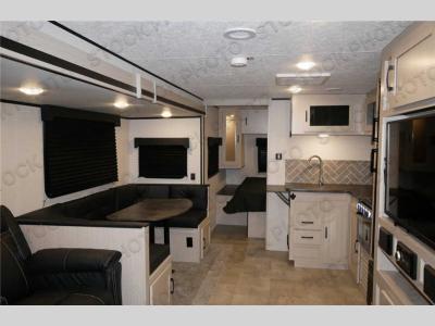 The modern interiors feature Casino Bisque cabinetry and Shaker cabinet door frames, seamless edge countertops and Congoleum residential flooring which are all complimented by the functional use of each space. Each model also includes a full bath and a functional kitchen making your camping adventures comfortable and easy. Outside, you'll find a power tongue jack, Solid Steps, a hot and cold exterior shower, plus many more conveniences. There are also super lube axles for easy towing, and a 200 watt solar panel with a 30 amp control charger for off-grid capabilities!