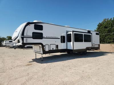 Each Chaparral mid-profile fifth wheel by Coachmen is designed with residential features, loads of storage space, and roomy bedroom suites to make you feel right at home. The durable construction means you can enjoy your RV for years to come. There's 6X double Azdel aluminum cage sidewall system, Weather Shield+ technology, and Tri-Tex powder coated frame technology that will help extend your camping season. Each model includes a Winegard Air 360+ HDTV/radio dome antenna to help keep you connected as you camp, slow rise blackout roller night shades, a new 16 cu. ft. side-by-side stainless glass 12V refrigerator, and a modern electric fireplace to make your space cozy. There is also a large transom window in the kitchen, a modern high-rise faucet, LED motion sensor lights in the bathroom, plus a full-size shower with glass doors and a seat. Now that's what I call luxury! Choose a Chaparral fifth wheel today!