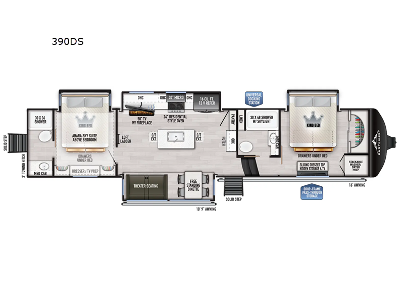 Sleeps 6 Slides 4 Length 42 ft 10 in Ext Width 8 ft 6 in Ext Height 13 ft 4 in Hitch Weight 3115 lbs Dry Weight 15664 lbs Cargo Capacity 3451 lbs Fresh Water Capacity 64 gals Grey Water Capacity 132 gals Black Water Capacity 88 gals Furnace BTU 40000 btu Available Beds Two King Beds Refrigerator Type 12V French Door with Double Drawer Freezer Refrigerator Size 16 cu ft Cooktop Burners 4 Shower Size 30" x 48" Number of Awnings 2 LP Tank Capacity 30 lbs Water Heater Type On Demand Tankless AC BTU 45000 btu TV Info LR 50" LED TV w/Swing Arm Awning Info 10' 9" and 16' Power with LED Lights Axle Count 2 Washer/Dryer Available Yes Number of LP Tanks 2 Shower Type Standard Electrical Service 50 amp Similar Fifth Wheel Floorplans