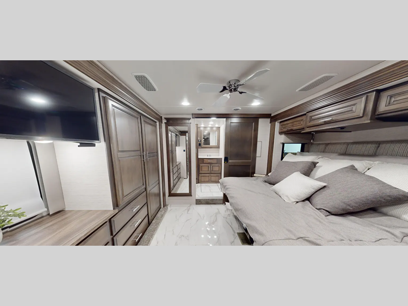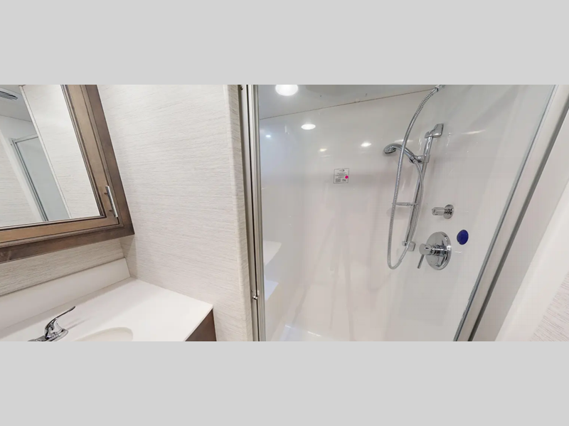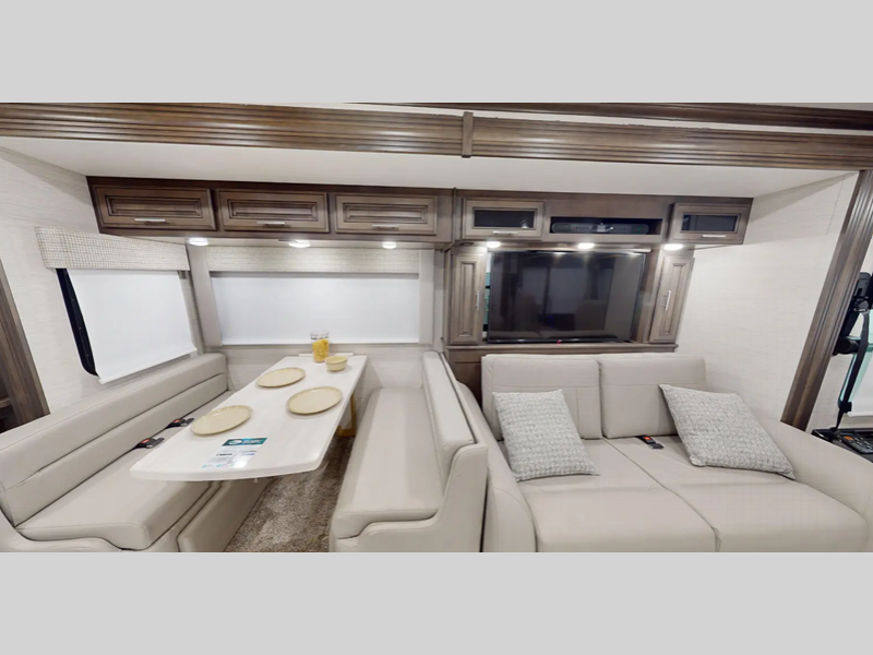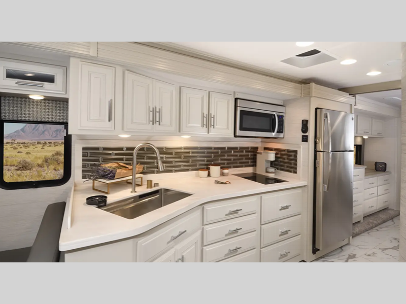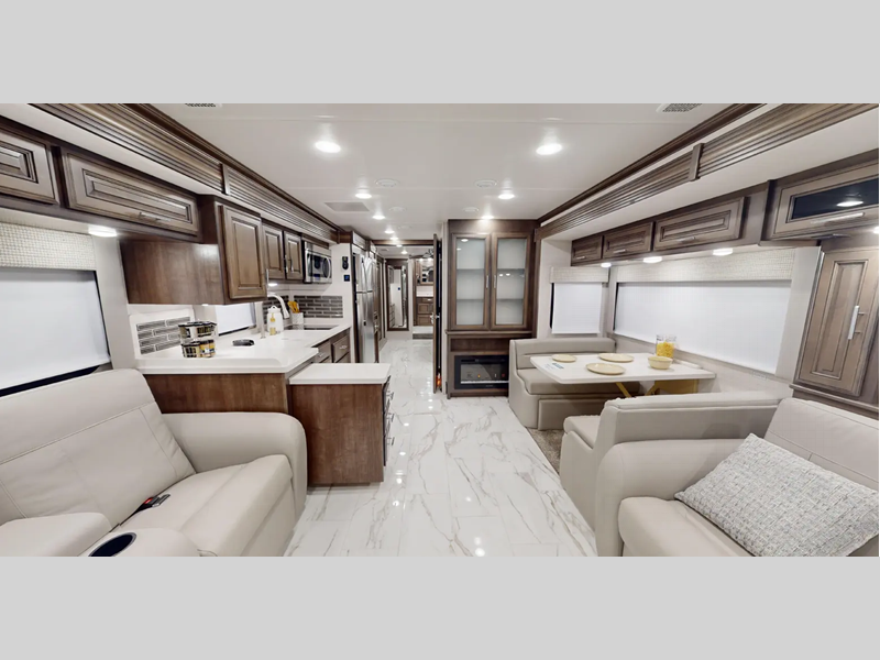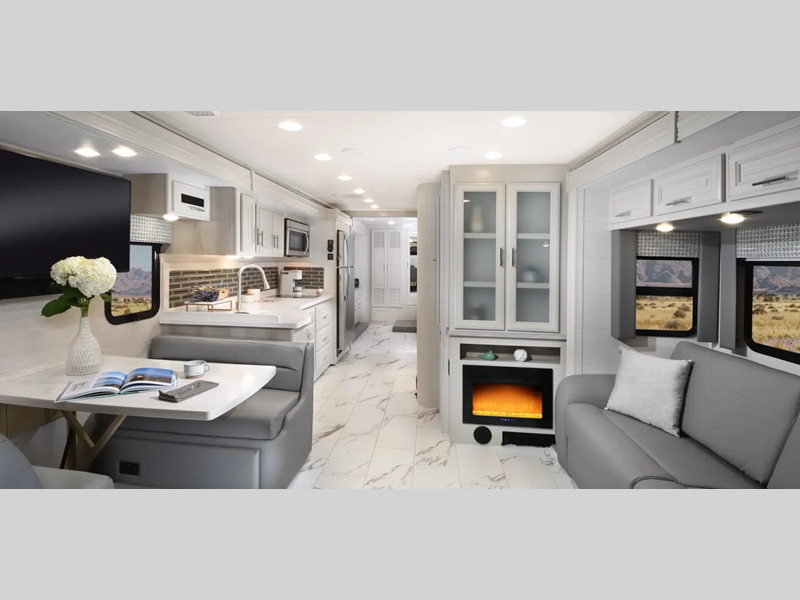 The Tru-Brace Anti-Camber chassis support system, along with the aluminum tube frame with Azdel composite sidewall fiberglass provides a durable foundation so you can enjoy your coach for years. You will love the driver console wireless cellphone charger, and your passenger will have their own stow away workstation to keep them busy on the way to the campground. Some of the interior luxuries you are sure to love are the polished porcelain tile throughout, the decorative window valances, and the polished solid surface countertops with mosaic tile backsplash!