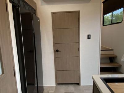 Stay in comfort with this four slide out fifth wheel! There is a triple-slide patio door that opens into the kitchen, complete with a kitchen island, floor to ceiling pantry and 16 cu. ft. 12V refrigerator, and a convenient half bath with storage. There are reclining seats with a chaise lounge across from an entertainment center and fireplace. The fold-up steps lead up to the loft that includes two bunk mats, a wardrobe, cubby storage, plus windows, which will make this space bright and open. The full bath towards the front includes washer/dryer prep, a walk-in shower with a skylight, and a linen closet to keep towels close by. And you'll love having your own bedroom up front with a king bed with Versa Tilt, a dresser with a bench, and a front wardrobe to keep your clothes wrinkle-free!