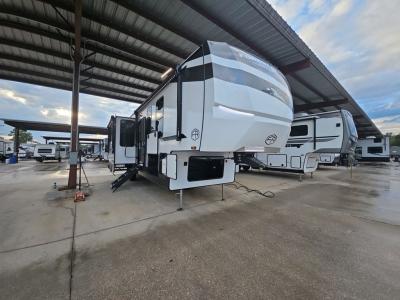 Enjoy a home on wheels with this fifth wheel! There are two bedrooms to choose from plus an upper loft with two 32" x 74" bunk mats, cabinets, and TV prep. The front private bedroom has a queen bed slide across from a dresser and next to a front wardrobe that is prepped to add an optional washer and dryer. The second bedroom has a queen bed slide across from a dresser with wardrobes on either side, plus it's very own full rear bathroom which has a tub and a rear entry/exit door to the unit. The second full bathroom has a one-piece fiberglass shower so everyone can get ready quickly in the morning. Prepare your best home cooked meals with the kitchen island and three burner cooktop then enjoy it at the free-standing dinette. Relax in true comfort each night in the theater seating across from the fireplace and 50" TV at the entertainment center!