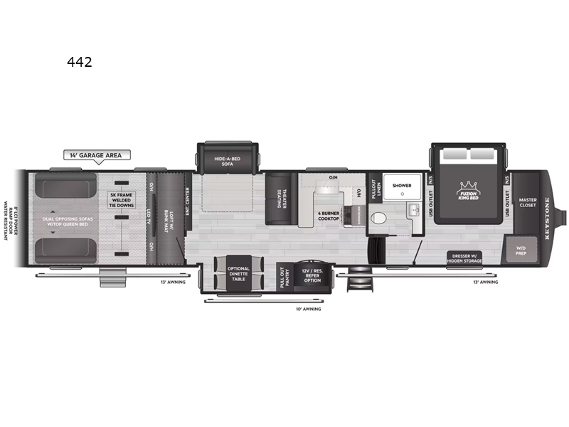 | TV Info | LR TV, Garage TV | Awning Info | 10', 13', 13' Girard Cassette w/LED Lighting |
