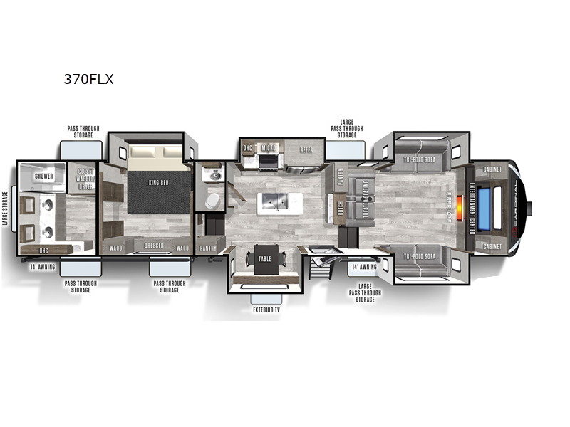 | TV Info | LR 50" LED Pop-Up TV, BR 32" LED TV, Exterior 32" TV | Awning Info | 14' and 14' Power with LED Lights |